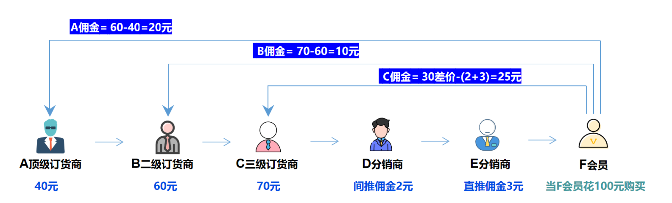 例:A顶级订货商价格(40),B二级订货商价格(60),C三级订货商价格(70),D间推佣金(2),E直推佣金(3), 当F会员购买后,A顶级订货商可以拿佣金(60-40=20),B二级订货